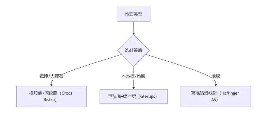 建议日常居家选择适当的居家用鞋(后跟封闭包裹,足弓支撑稳定,湿滑地面防滑,一脚蹬方便)。洗澡时可穿防滑的拖鞋,其余在家中的时间还是穿居家用鞋更好些。