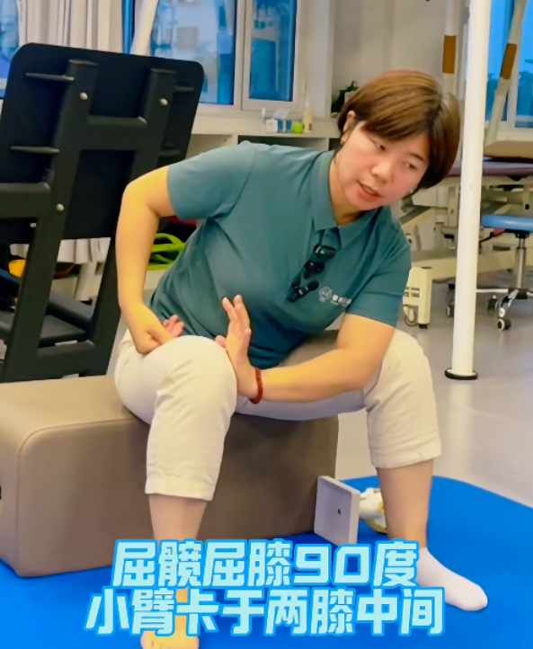 ▶ 坐姿屈髋屈膝90°,双膝与髋同宽。一手小臂卡与双膝之间固定膝关节