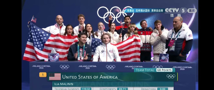 花样滑冰团体,美国凭借马里宁在男单自由滑的出色表现,绝杀日本队,“卫冕”成功(北京冬奥冠军原属俄罗斯,后被国际奥委会剥夺,美国银变金)。美国队还获得高山滑雪女子速降的金牌,直接从未上榜金牌榜,到2金排名第2!